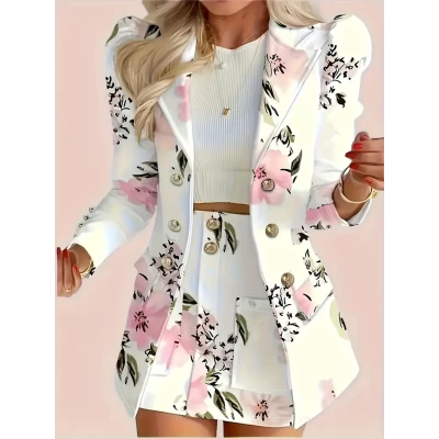 Elegant Two-piece Set, Fashionable Double Breasted Lapel Suit Jacket And High Waisted Floral Print Mini Skirt, New Women's Set