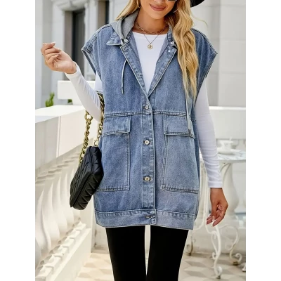 Women's Casual Oversized Denim Vest - Mid-Length, Sleeveless Jacket with Ripped Detail, Button Closure