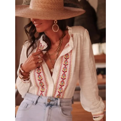 FENGBAY Women's Casual French Embroidery Shirt - A breathable and comfortable white shirt with colorful floral patterns.