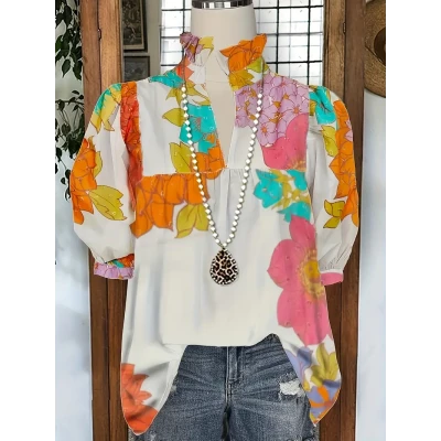 Women's Casual Floral Print V-Neck Short Sleeve Top with Pleated Cuffs - Lightweight Polyester Blouse for Spring, Summer & Fall, Floral Print Blouse