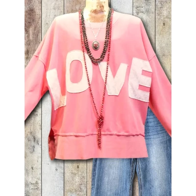 Casual Loose Fit Graphic Crew Neck Sweatshirt - Cozy 'LOVE' with Raw Hem & Side Slits - Perfect for Fall/Winter & Valentine's Day