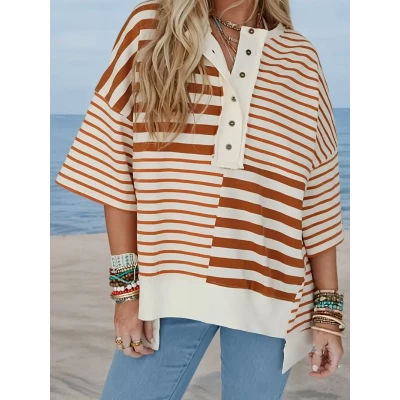 [Summer Shirt] Lightweight Breathable Women's Oversized Striped Patchwork Shirt | Relaxed Fit Short Sleeve Round Neck Top with Button Front for Spring/Summer Casual Wear